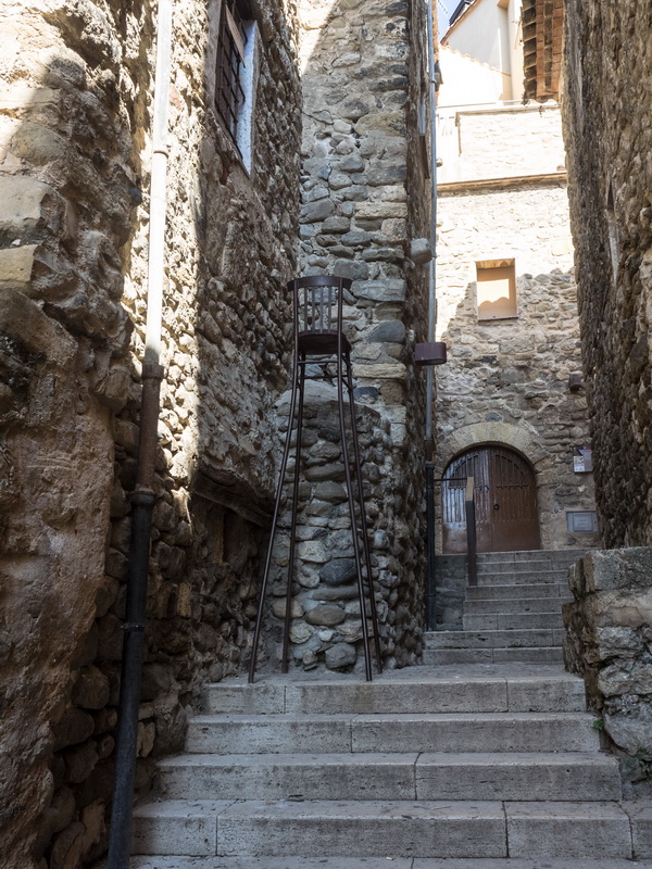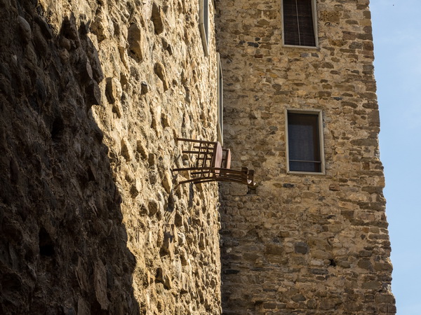 Одна из главных достопримечательностей этого города - вот такие стулья, вделанные прямо в стены домов. Это старинная традиция. В Средние века городку изрядно досаждали всякие ведьмы, которые носились туда-сюда на метлах и периодически влетали в окна домов, чтобы слегка передохнуть. Тогда жители города стали вмуровывать в стены домов вот такие стулья - для отдыха ведьм, чтобы те не тревожили жителей в их квартирах. Кроме того, на таком стуле долго-то не посидишь, так что ведьмы залетали в городок все реже, а в последние годы их уже вообще, к сожалению, не видать.