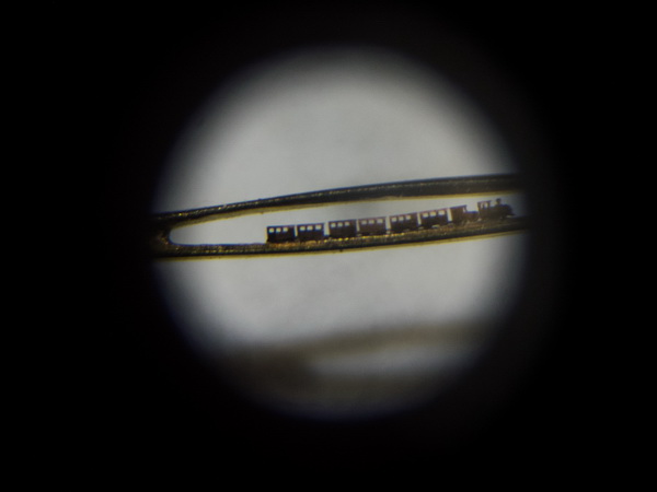 Состав с вагончиками, засунутый в ушко швейной иглы.