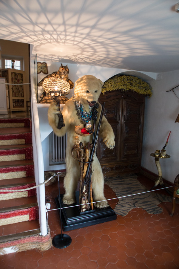 Медвежья прихожая. Вас встречает чучело медведя с плетеной лампой в лапах. Абажур лампы Дали сделал из снасти для ловли креветок. На шее медведя подвешен поднос для писем.