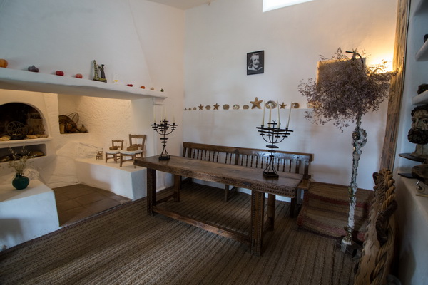 Маленькая столовая с камином рядом с прихожей. Вдоль стен - морские звезды. Стоящие на столе подсвечники сделаны по эскизу Дали.