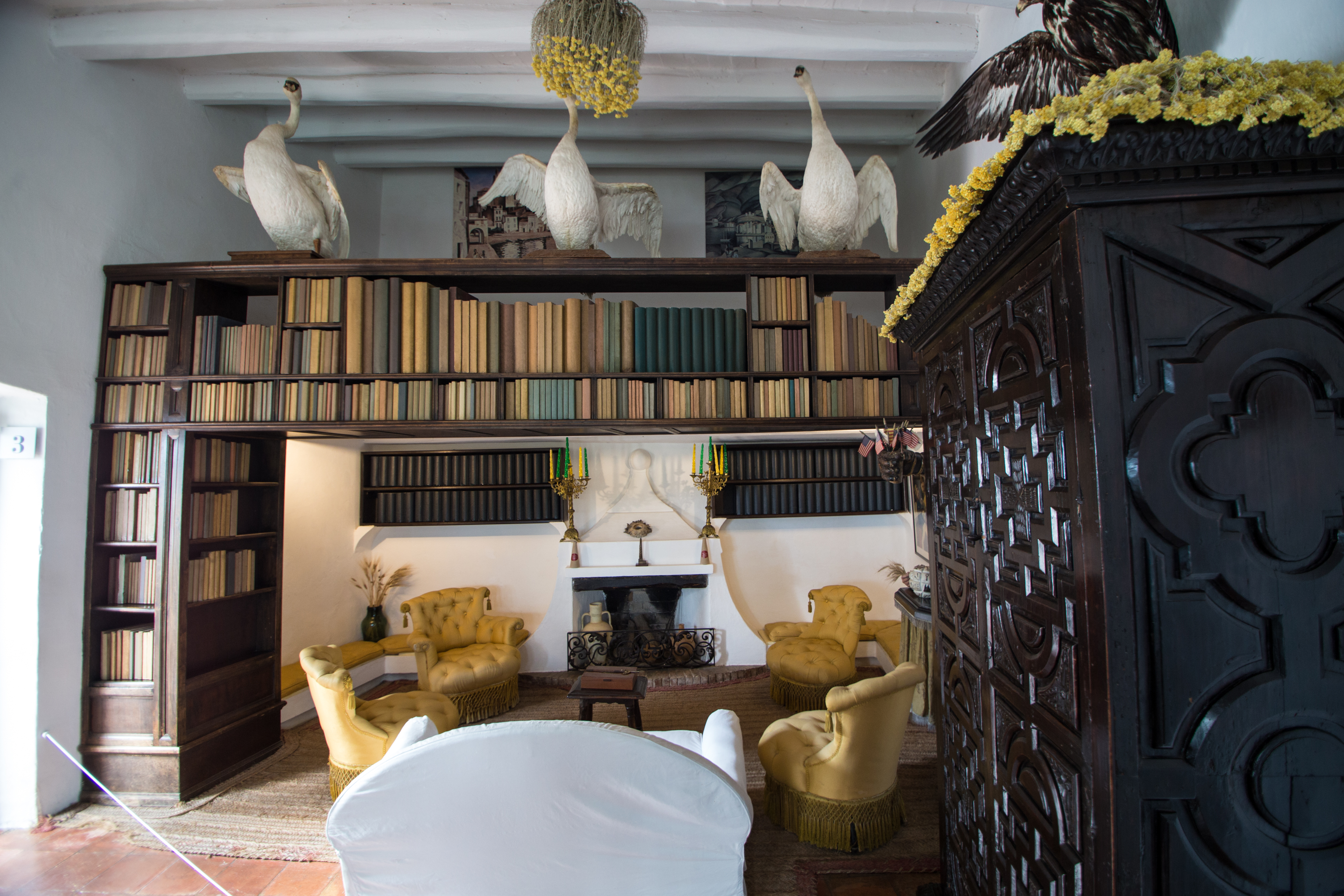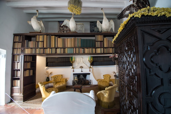 Библиотека. Книги (Дали был хорошо образован и очень много читал) перевезены в театр-музей, здесь стоят муляжи. Пучок бессмертника вместо люстры и охапки бессмертника на шкафу.