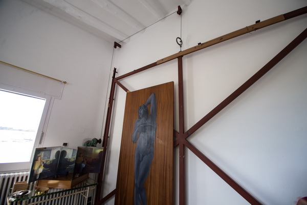 У художника было несколько очень крупных полотен - по 5-6, а иногда даже и по 10-12 квадратных метров. При этом Дали обычно работал сидя: долго стоять он не мог из-за болей в спине. И у него в мастерской была установлена огромная металлическая рама, с помощью которой полотно можно было перемещать по высоте - для удобства работы.