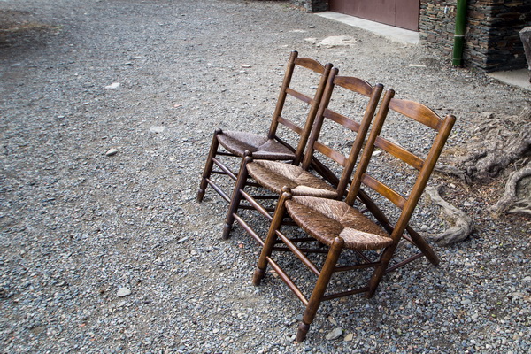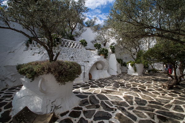 Тенистый дворик со скамейками и парой каменных стульев причудливой формы.