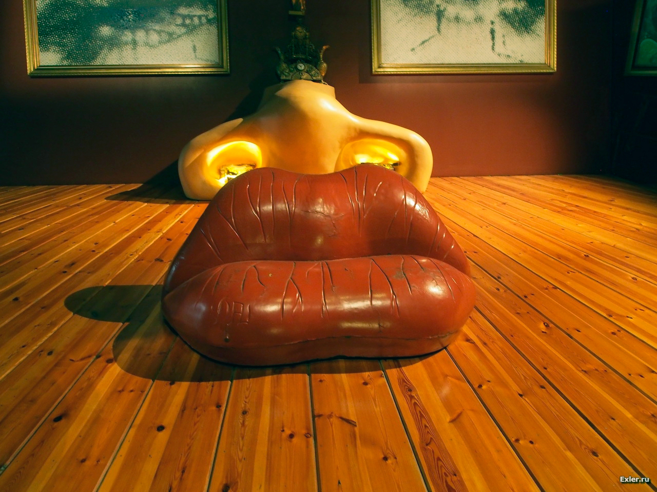 Кстати, оригинальный диван в форме губ имеет несколько другую форму - вот он. Он вообще был создан как часть знаменитой композиции театра-музея: там с помощью двух картин (глаза), двойного камина (нос) и дивана в форме губ образовывалось лицо.