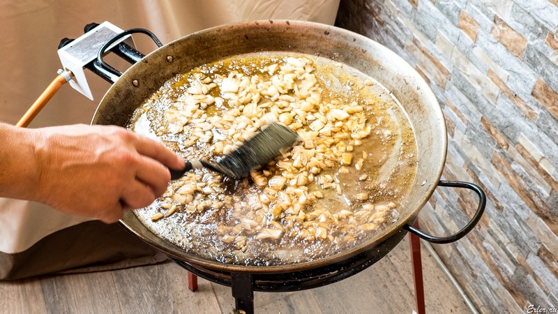 В Валенсии, как я уже писал выше, в паэлью кладут кролика, курицу и улиток, и там процесс приготовления идет следующим образом: на середину паэльеры сначала кладется кролик, как самое плотное мясо, обжаривается, потом кролик сдвигается к краю паэльеры, а в центре обжаривается курица, затем курица отправляется к краям сковороде, а в центре обжаривают различные овощи, ну и после этого добавляют рис, заливают бульоном и под крышку.