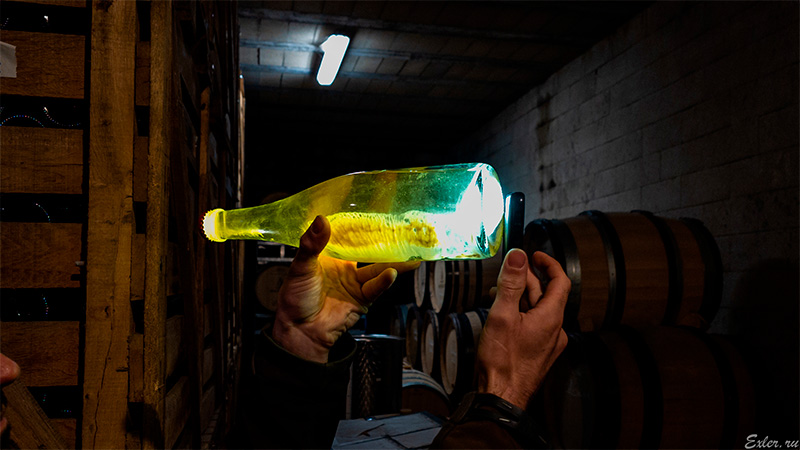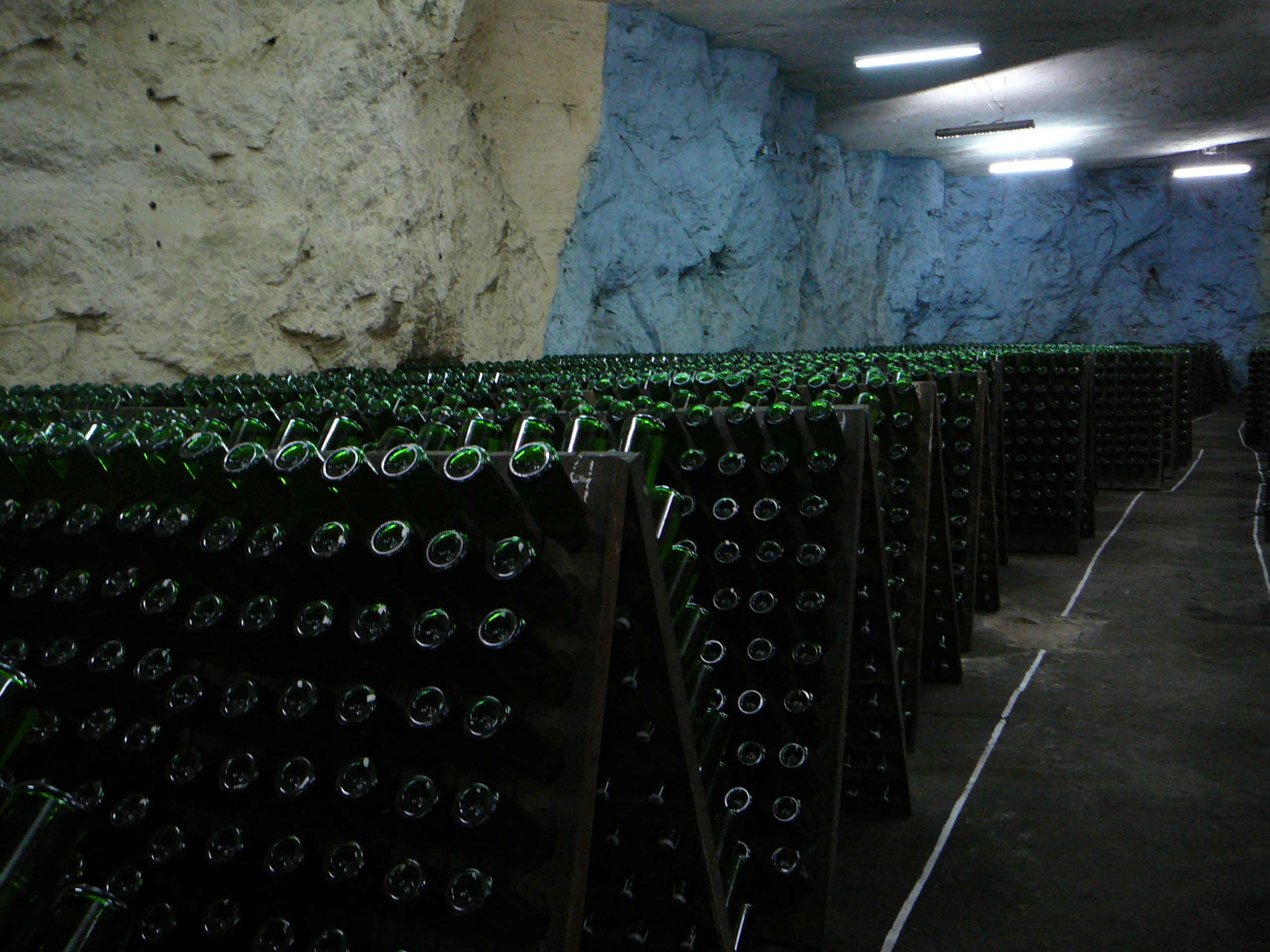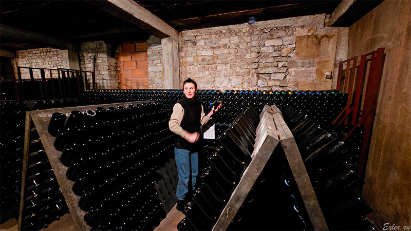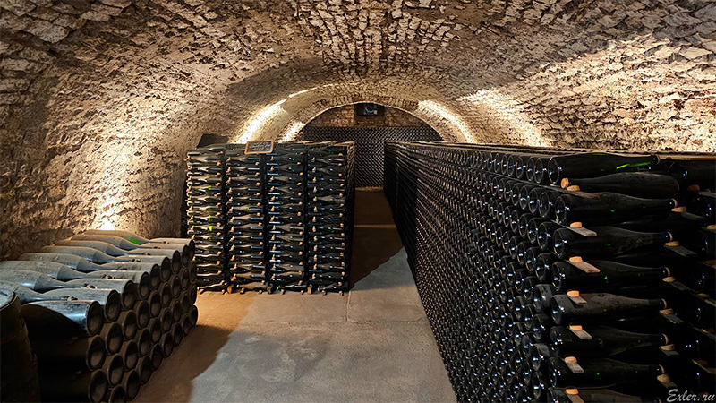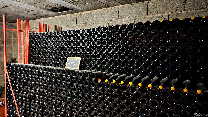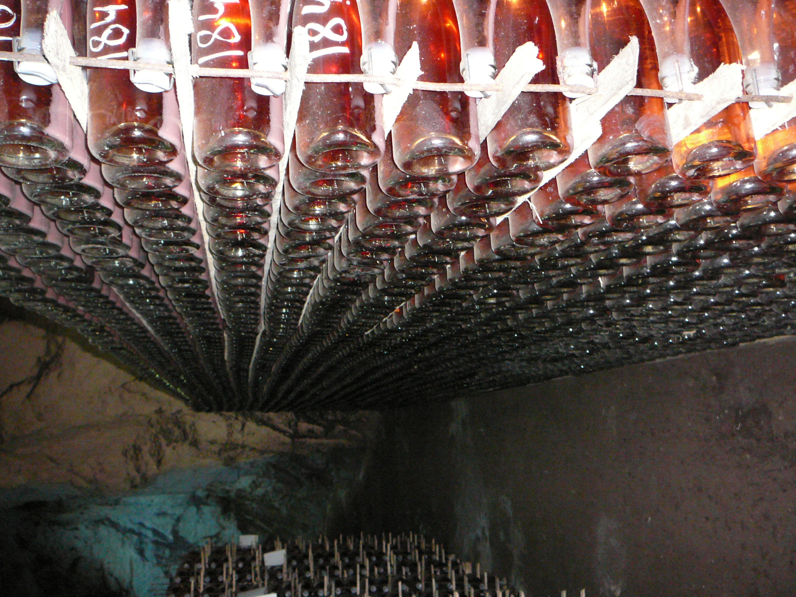 После окончания вторичного брожения бутылки укладываются горизонтально, и там начинается длительный процесс созревания шампанского на осадке
