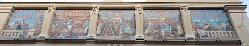 Сверху там изображены все процессы создания шампанского - так, как это делалось пару веков назад.