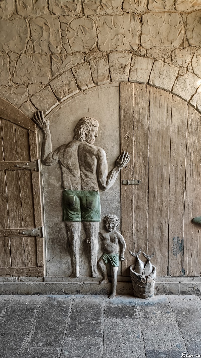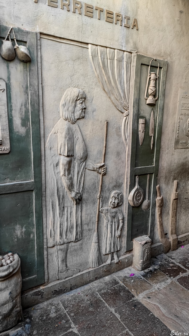 На одной из улочек города обнаружились вот такие впечатляющие горельефы. Причем улочка совсем узкая, темная, снимать было сложно.
