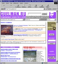 "Современное искусство в сети" - это целый портал, который вырос из сайта Марата Гельмана "Guelman.Ru" (http://www.guelman.ru). Действительно, на страницах этого ресурса представлены: современное искусство в сети, арт-критика, современная русская литература, обзоры RUлиNET-а, современная музыкальная жизнь, информационное агентство "Культура", "Неофициальная Москва", культурные герои 21-го века, Художественный Журнал, музей современного искусства и многие другие проекты, о которых я не хочу писать, потому что вы сами можете с ними ознакомиться, посетив сайт "Современное искусство в сети" (http://www.guelman.ru).