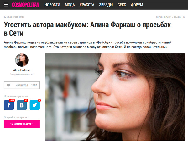 Алина публикует счет, а потом не верит своим глазам: необходимая сумма (в общем и целом немаленькая, потому что макбук стоит недешево, однако в масштабах нескольких десятков тысяч подписчиков - довольно скромная) набирается буквально за полдня. После этого Алина убирает реквизиты счета из поста (деньги все-таки собираются под конкретную целевую задачу - макбук), пишет прочувствованное письмо своим читателям, ну и, казалось бы, хеппи-энд, все расчувствовались, все довольны. И заметку Алины об этой истории опубликовали в "Космополитэне" - "Угостить автора макбуком: Алина Фаркаш о просьбах в Сети".