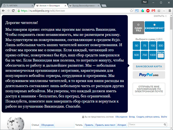 С пожертвованиями, - это моя Википедия, я ее читаю, я ее оплачиваю, я ее иногда редактирую. А с баннером читать конечно не перестану, а вот редактировать точно больше не буду - не интересно. Надеюсь, они это тоже понимают.