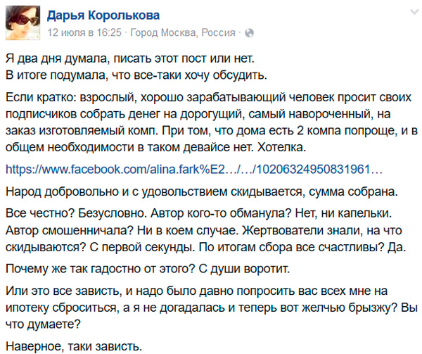 Что бы я сказал, если бы кто-то из моих любимых авторов - ну, например, Дима Быков или Дима Губин - объявил о том, что он лишился своего ноутбука, не имеет возможности приобрести новый и вынужден обращаться за помощью к своим читателям? Я вообще ничего бы не стал говорить, я бы немедленно перевел деньги, обрадовавшись тому, что могу хоть как-то помочь людям, которых я давно читаю и очень уважаю. Что в этом вообще плохого? Что в этом неэтичного?