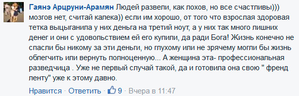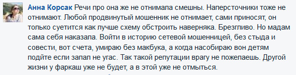 В-третьих, особую ненависть у милых дам вызвал даже не сам факт сбора денег на ноутбук, а то, что Алине, видите ли, не подошел ноут с Windows и она собирала деньги на макбук. На макбук, сучка, собирала, фря такая, возмущались милые дамы, причем не просто на макбук, а на крутой макбук. За это убивать надо, считали некоторые из этих милых дам, - и уже готовы были истыкать Алину пилочкой для ногтей.