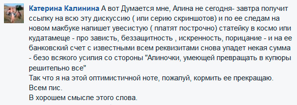 Вроде бы, если подумать, все это касается только Алины и её читателей. Никто никого не заставлял, на что собираются деньги - было рассказано предельно честно, реквизиты счета были убраны, как только требуемая сумма была собрана. В чём проблема-то?