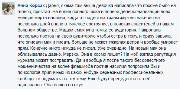 Полагаю, ровно наоборот. Возмущались дамы с папиком. Как так, им приходится сексуально отрабатывать подачки ненавистного папика, а тут, понимаешь, "просто так" взяли да и собрали денег. Они считают это такой же подачкой и возмущены, что журналистку не поимели так как имеют их.