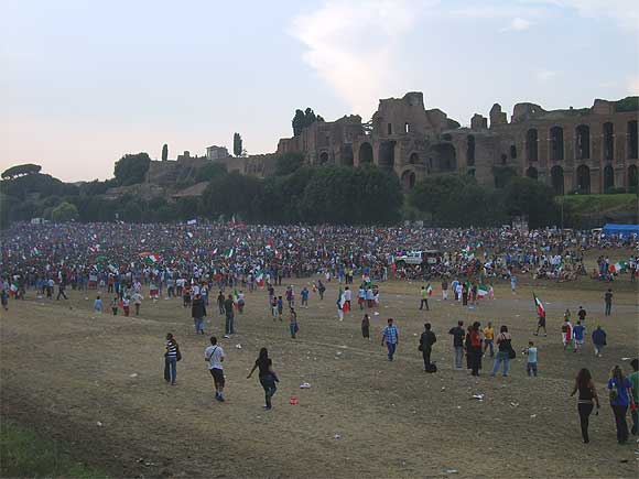 Впрочем, периодически здесь все-таки собираются толпы народу: то на рок-концерты, то для совместного просмотра каких-нибудь важных спортивных состязаний (передачи транслируются на огромных экранах). Вот, например, фотография трансляции с чемпионата мира по футболу 2006 года - Италия играет с Францией (взята отсюда):