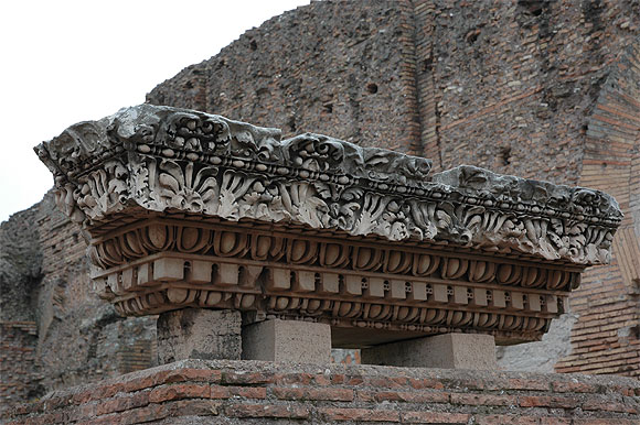 Вблизи развалины Палатина, конечно, не производят сильного впечатления - осыпающиеся камни, да и только-то. В древности оно все было отделано мрамором, красиво раскрашено и так далее. Мы же вынуждены наблюдать только каменные остовы, а оценить былую красоту можно только по какой-нибудь случайно сохранившейся изящной мраморной или каменной финтифлюшке вроде такой:
