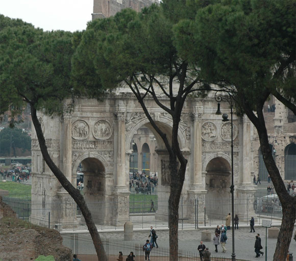 Впрочем, когда приближаешься к Колизею со стороны Большого Цирка, в первую очередь в глаза бросается арка Константина, стоящая совсем рядом с Колизеем. С холма Палатина ее загораживают деревья, но выглядит сооружение все равно очень внушительно:
