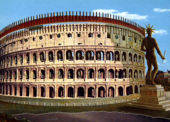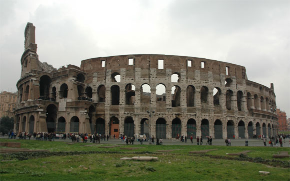 Но вернемся к Колизею. В оригинале он называется амфитеатр Флавия - по имени императора Флавия Веспасиана, который был инициатором строительства этого здания. Возводить его начали в 70 году н. э., а закончили при императоре Тите в 80 году. Размер кольца амфитеатра - 188х156 метров, так что сооружение просто колоссальное, за что оно и получило второе, более известное сейчас название Колизей (Collosseum). Впрочем, некоторые историки считают, что это название амфитеатр получил по некогда стоящей рядом с ним огромной скульптуре Колосс Нерона (статуя из позолоченной бронзы высотой более 35 метров).