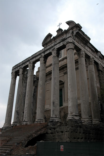 Рядом с Храмом Божественного Ромула также хорошо сохранился Храм Антонина и Фаустины: его построил император Антонин Пий в честь своей жены, а после смерти императора Сенат посвятил этот храм также и ему.