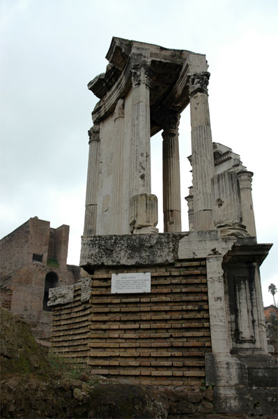 Так вот, нас очень интересовало это заведение. Как только мы видели на Форуме какой-нибудь более или менее сохранившийся храм, то тут же подбегали к нему с радостными криками: "Храм Весты, Храм Весты". Но оказывалось, что это не он. И только внимательно читая надписи у всяких обломков мы выяснили, что вот эти несколько колонн близ Палатина - и есть остаток Храма Весты.