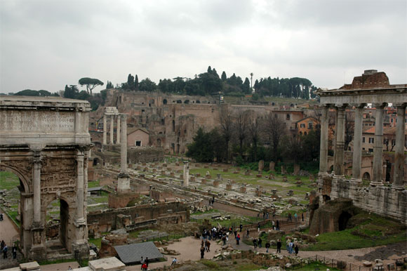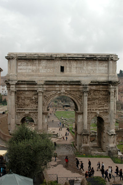 От этой арки начинается интереснейшее место - Римский Форум (Roman Forum). Правда, многие туристы, которых загодя готовят перед встречей с прекрасным, почему-то взращивает в себе какие-то нереальные ожидания и, появились на Форуме, недоуменно восклицают: "Ну, и на черта нас сюда привели? Это же какой-то пустырь с изредка валяющимися обломками!"