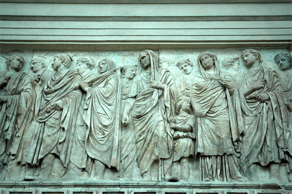Как оказалось, этот алтарь был возведен Сенатом в 13 году д.н.э. в честь триумфального возвращения императора Августа после победы над Испанией и Галлией. Алтарь установили в северо-восточном углу Марсова поля, однако после падения Рима его затопило Тибром, сооружение было разрушено, а некоторые панели с него всплывали потом (образно говоря) в коллекциях Медичи, Ватикана и других влиятельных персон.