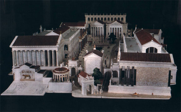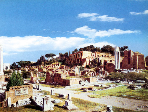 В переводе с латыни Forum означает площадь как таковую и рыночную площадь в частности. Поэтому изначально на Форуме располагались два рынка - овощной и рынок деликатесов. А где рынок - там, разумеется, тусовка, общение, обмен мнениями, споры и заключение деловых контрактов. Кроме того, на Форуме была специальная трибуна для политических выступлений, и вокруг нее разгорались такие жаркие споры по поводу судьбы несчастного Карфагена, что в конце концов рынки перенесли в другую зону, а Форум был застроен всякими храмами и общественными заведениями и стал любимым местом делового и праздного времяпрепровождения. Также там ставили спектакли и проводили гладиаторские состязания, которые пошли на убыль после сооружения Колизея.