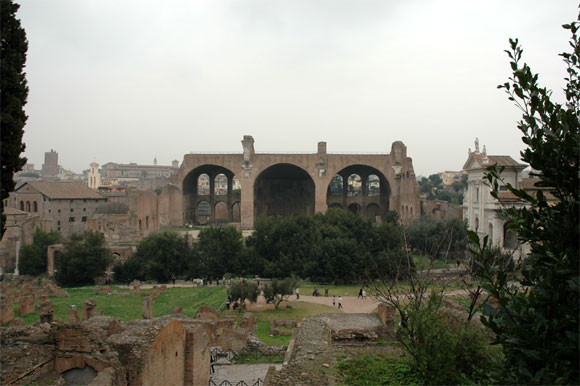 Одно из самых впечатляющих зданий на Форуме - остатки собора (базилики) Максенция. Сооружение (точнее то, что от нее осталось) огромное и смотрится очень эффектно. Вот как собор выглядит издали, со стороны Палатина: