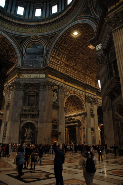На фотографии балдахин Бернини выглядит серенько (было же темно, да и снять его непросто), а в действительности он очень внушительный. Обвитые виноградными листьями колонны, кстати, происходят из Греции.