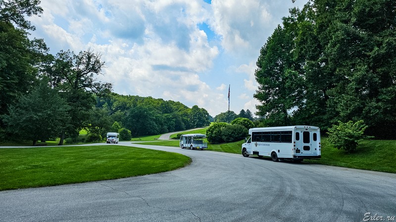 Территория очень большая, по ней катается экскурсионный автобус, а также шатлы, которые в основном разъезжают от ресепшн до поместья (музеев).