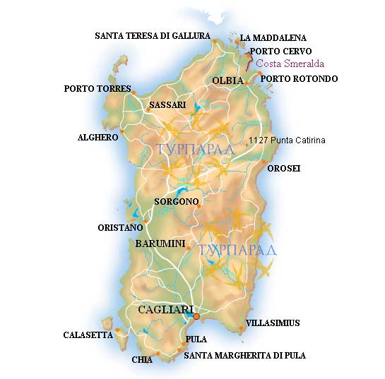 Сначала - чистая география, ничего личного. Сардиния - один из самых больших островов Средиземноморья (обгоняет его только Сицилия, в результате чего на Сардинии лучше не произносить имя заклятого конкурента всуе). Остров вытянут в длину, подобно сандалии (подражая, вероятно, старшему итальянскому брату - сапогу), и от крайней северной точки до крайней южной - примерно триста километров (пять-шесть часов езды небыстрым автобусным шагом). Несмотря на относительно небольшие размеры острова, климат и природа в северной и южной части довольно заметно отличаются друг от друга. Примерно то же самое происходит с западом и востоком Сардинии, поэтому если все время путешествовать - может показаться, что вы объезжаете регион, на порядок больший, чем 25 тысяч квадратных километров, которые составляют площадь этого острова. Население - один миллион двести пятьдесят тысяч человек, причем в туристический сезон эта цифра несколько увеличивается.