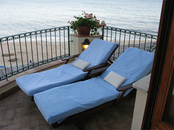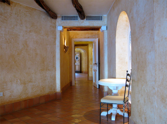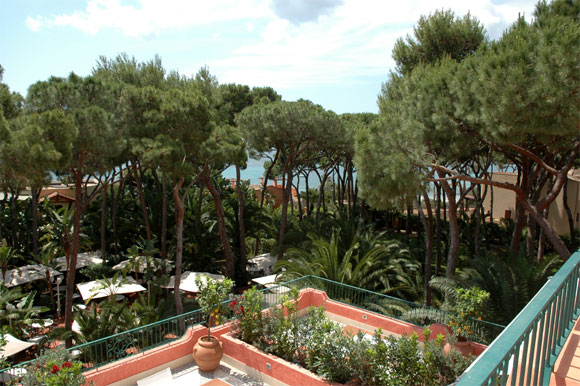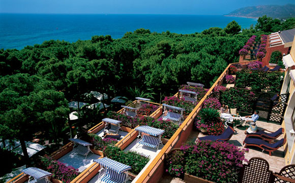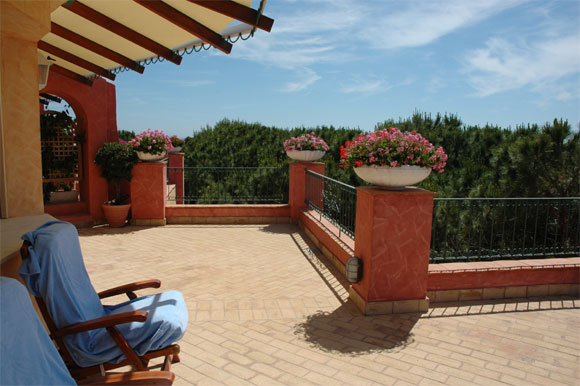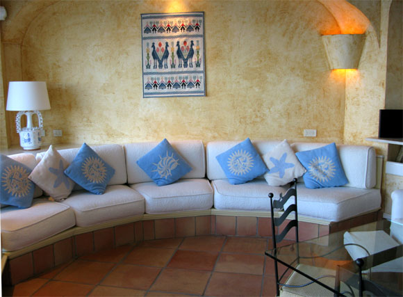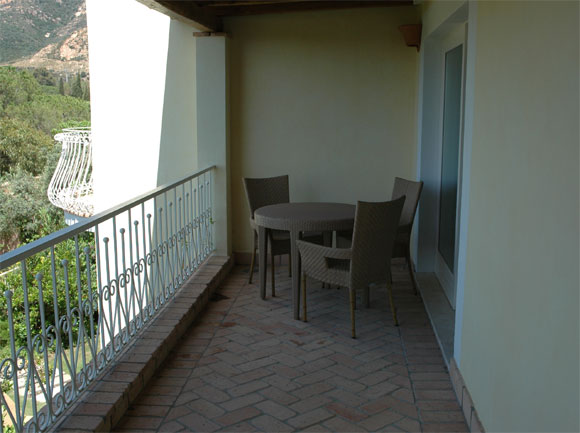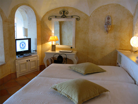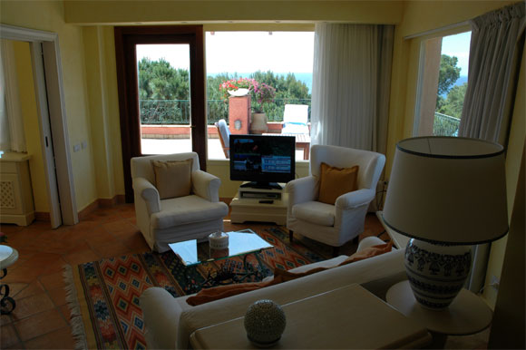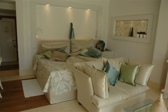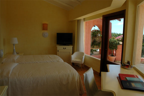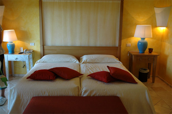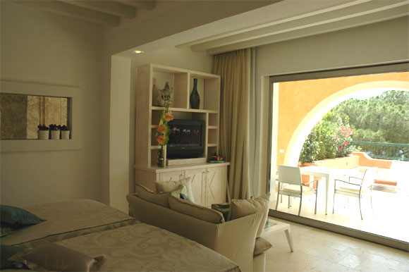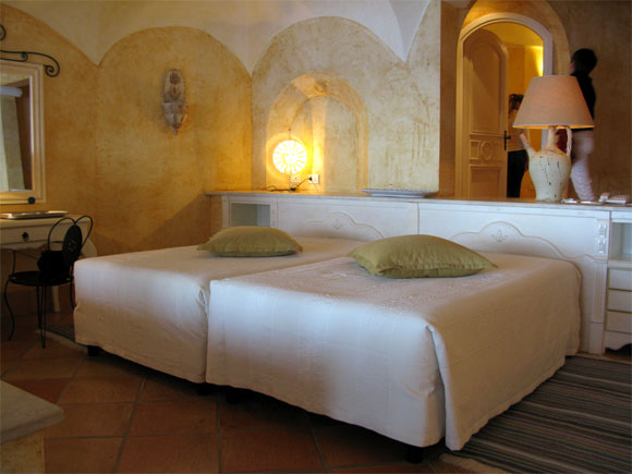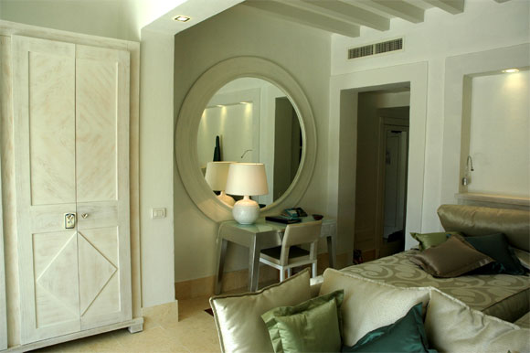 Впрочем, внутри отеля сардской аскетичностью даже и не пахнет, как, например, в Grand Hotel Colonna. Номера в Castello роскошные и очень стильные. Часть номеров, выходящих прямо на море и сосновую рощу (они имеют приставку Mare, то есть морской), включают лоджию под навесом и открытую террасу с видом на рощу и море. На террасе можно загорать или развлекаться каким-нибудь другим оздоравливающим или расслабляющим образом.