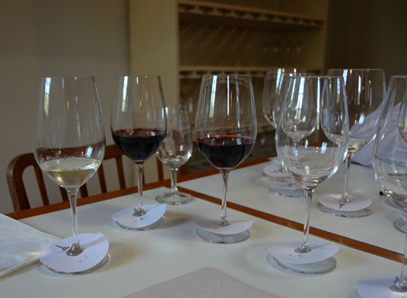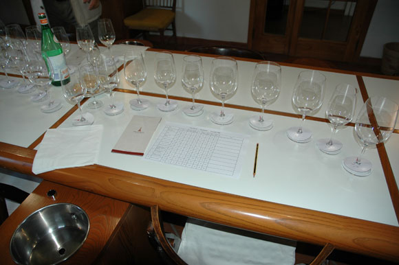 Перед каждым дегустирующим стоит набор бокалов - по одному для каждого из видов вина.