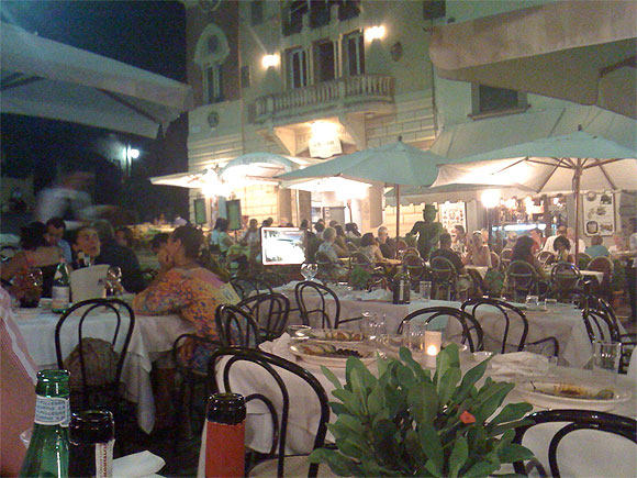 Приходим в рекомендованный кабачок - и застываем в неизбывном разочаровании: главная площадь города, куча кабачков и все - на сто процентов туристические. То есть там за столиками сидит куча туристов из самых разнообразных стран, лупит какие-то бутерброды, пьет пиво (пить пиво в Италии - это уже вообще за гранью добра и зла) и так далее. Картина для людей, которые знают, что такое есть в чисто туристических местах, удручающая.