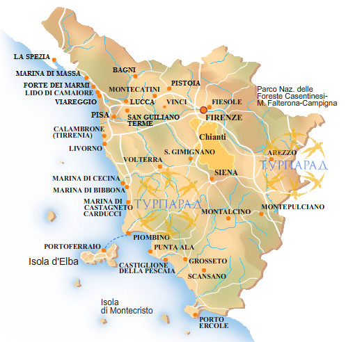 Между тем в Тоскане существуют возможности безмятежного отдыха не только на побережье. Это замки, отели, виллы и термальные курорты Внутренней Тосканы (термин совершенно неофициальный). Кроме того, это Кьянти, Монтальчино, Монтепульчиано - области, известные на весь мир своим изумительным вином.
