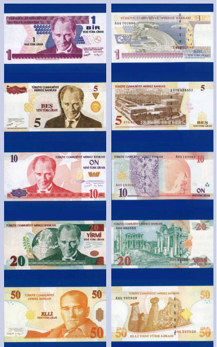 Основная денежная единица - турецкая лира (TRL - Turk Lirasi). Совсем недавно курс лиры составлял 1,3 миллиона лир за один доллар, что создавало огромные проблемы туристам: все эти сотни тысяч, миллионы и десятки миллионов мельтешили в глазах, и, чтобы понять, сколько ты платишь, приходилось аккуратно пересчитывать пальчиком нули на купюрах, иначе можно было перепутать тридцать центов с тремя или тридцатью долларами. Да и мелкие торговцы на рынках любили подсовывать туристам, например, 500 000 лир вместо 5 000 000, потому что без должной практики отличить одну купюру от другой было сложновато, а бесконечно считать эти нули - весьма утомляло.