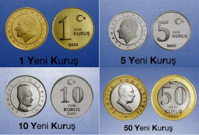 После деноминации были введены мелкие медные деньги, которые называются "куруш" (kurus). По внешнему виду они похожи на уменьшенные железные евро.