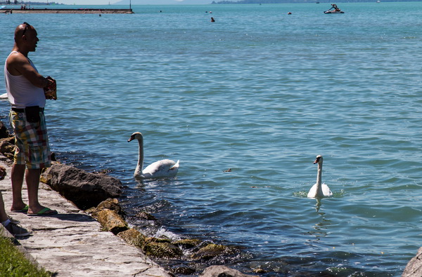 Везде на Балатоне можно встретить лебедей. А лебеди всегда надеются, что им достанется что-нибудь вкусненькое.