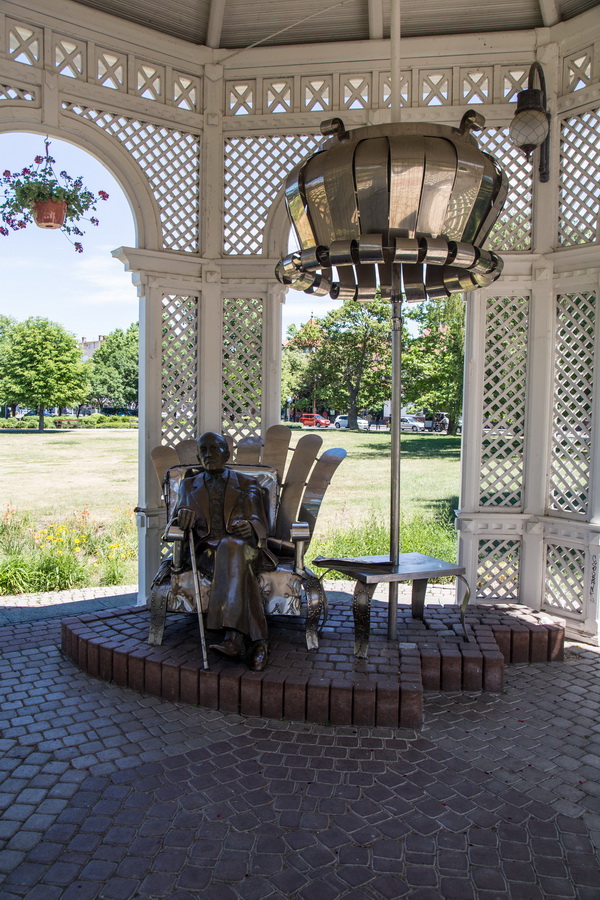 Заходишь в беседку, а именно он там и сидит. Ну, точнее, скульптура маэстро - в его любимом кресле, под его любимым абажуром.