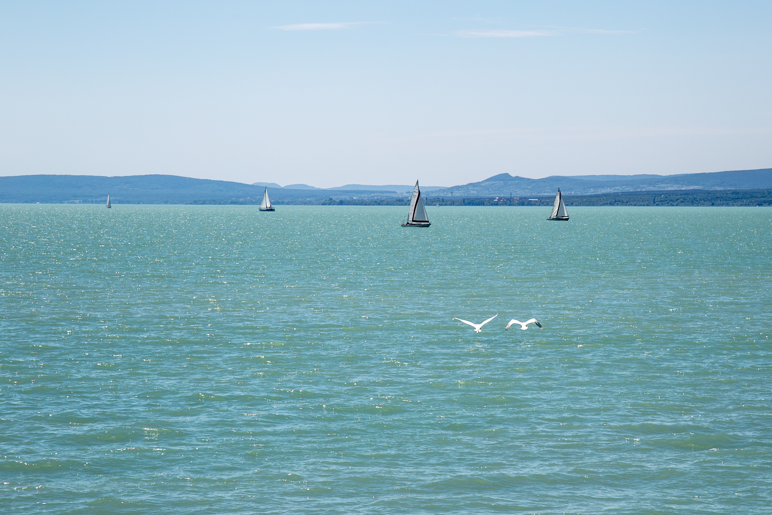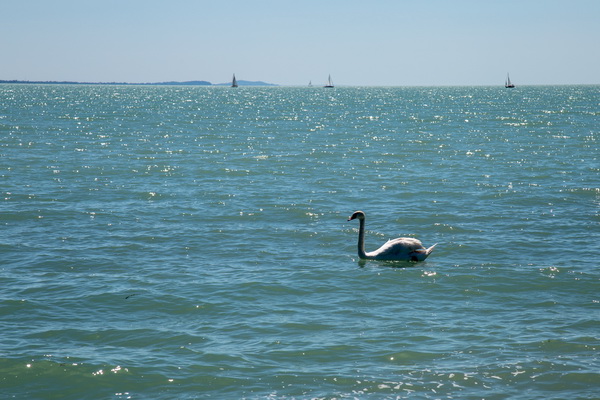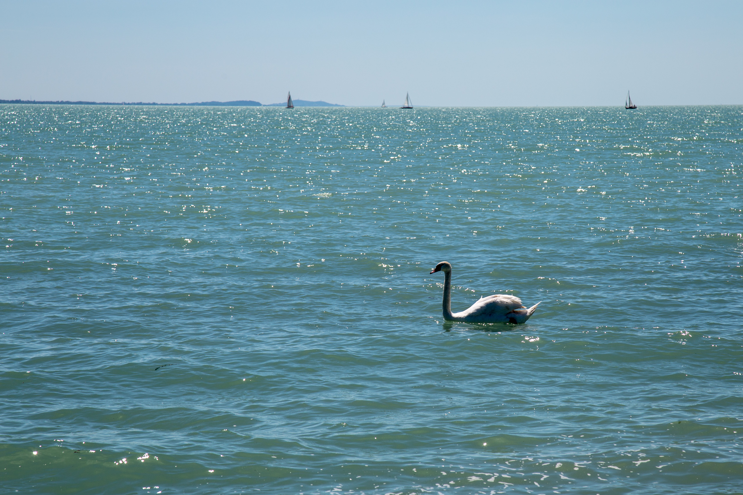 В ожидании парома любуемся парусниками, а на нас любуется лебедь. Скоро на Балатоне будет проходить крупная регата: в Балатонфюреде к ней активно готовятся.