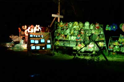 Эти торговые палаточные городки и днем-то выглядят очень забавно, а уж ночью, когда вы едете вдоль шоссе, не освещенного ни одной лампой, как вдруг чуть ли не посреди чистого поля вырастают стройными рядами включенные телевизоры, вокруг которых шеренгами расставлены игрушки, - создается впечатление, что или твоя крыша улетает в теплые края, не оставив даже предсмертной записки, или на Землю спустилось нечто инопланетное, чтобы изучать нас и клонировать для перепродажи в другие галактики.