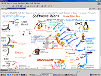 В центре карты располагается величественная "Империя Майкрософт", которую со всех сторон осаждают всякие зловредные операционные системы и программные пакеты. На карте яркими вспышками отмечены участки наиболее ожесточенных боев. Как вы понимаете, особенно трудным является участок различных версий Windows, который подвергается серьезным атакам со стороны Linux и GNU. Положение осложняется тем, что у этих операционных систем есть весьма надежные тылы в виде Open Source, чем никак не может ответить Microsoft, потому что если император Гейтс решит открыть свои тылы, то весь мир выяснит, что хваленые автоматические оборонительные и атакующие машины на самом деле приводятся в движение не хитроумными механизмами, а всего-навсего скопищем рабов, которых надо непрерывно кормить и поить, причем их аппетиты все увеличиваются и увеличиваются.