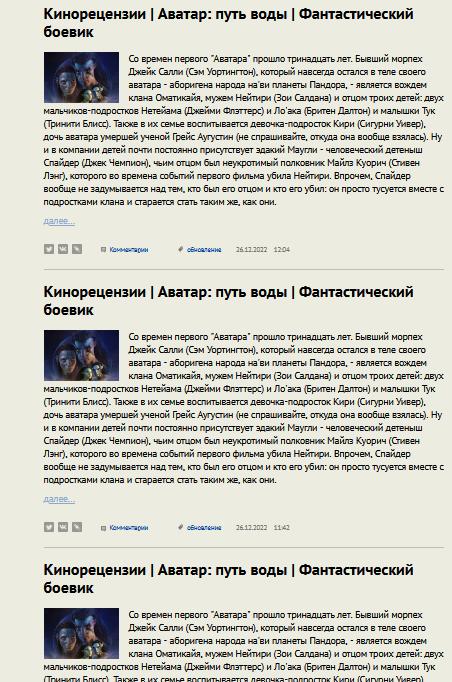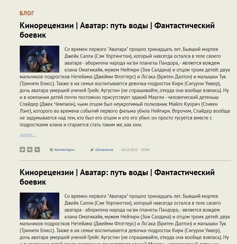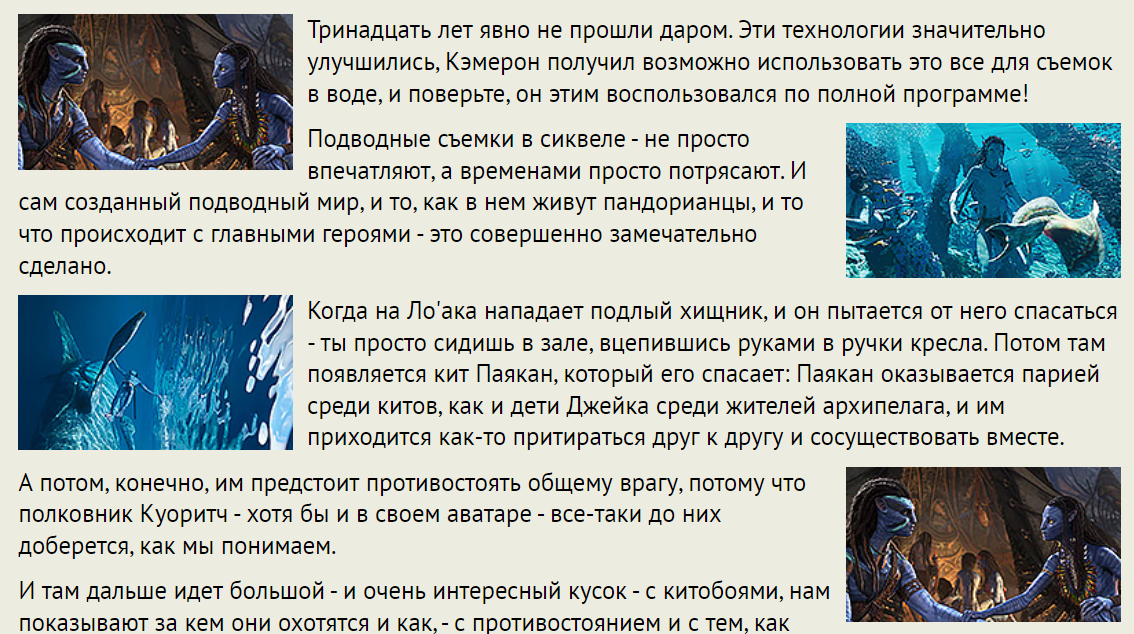 Так что я не только не разочарован сиквелом "Аватара", а совсем наоборот - я получил потрясающее зрелище, я получил погружение как в уже знакомые, при этом очень впечатляющие, так и в совершенно новые потрясающие подводные миры, также я увидел отлично сделанный динамичный приключенческий боевик. Но, конечно же, это все нужно смотреть на большом экране, потому что то, что создал Кэмерон со своей командой - это требует полного погружения, чтобы разглядеть это все во всех подробностях. И я просто в восторге, честное слово!