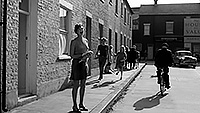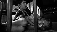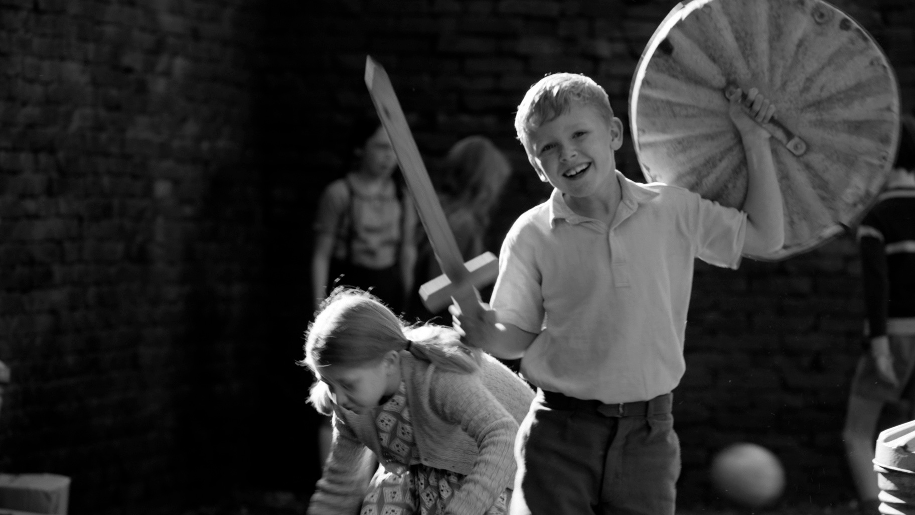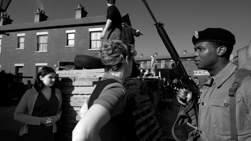 Дальше действуем по четкой схеме. Сначала в цвете показываем современный Белфаст, но тут же память нас уносит в черно-белый август 1969 года ("Рома"-то вся - черно-белая), и далее эти события мы будем показывать глазами трогательного мальчишки с обязательной щербинкой во рту, которому пришлось взрослеть, находясь внутри неприятных и опасных событий.