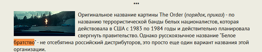 На финальных титрах содержится надпись о том, что книга "Дневники Тёрнера" еще 40 лет служила пособием по внутреннему терроризму, оказывая влияние на различные события, включая захват Капитолия 6 января 2021 года. Ну, захват Капитолия тут явно притянут за уши, однако влияние этого творчества душевнобольного на таких же душевнобольных трудно переоценить.
