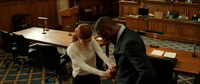 Вот она пришла к адвокату (Идрис Эльба), который, ну конечно, работает только с хорошими людьми, а с плохими он не работает принципиально. (Да-да, знаем мы таких адвокатов, конечно.) И он читал о Молли в СМИ, где ее расписывали как преступницу. Поэтому он с ней не будет работать. Хотя его дочка читала книжку Молли и восхищается Молли. (В действительности книжка была написана уже после суда.) Но когда адвокат узнал, что Молли никого не сдала, он стал ее защищать. А потом ее полюбил. И стал ей настолько доверять, что один раз даже дал ей телефон с данными всех своих клиентов - чтобы Молли доверилась ему и отдала свои жесткие диски.