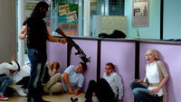 "Посмотрим, чем я смогу тут помочь", - говорит Влад Милицейскому Начальнику, после чего бросает свой пестик и идет в банк совершенно без оружия. Бандиты его впускают, потому что Влад - главный герой фильма и к тому же режиссер.
