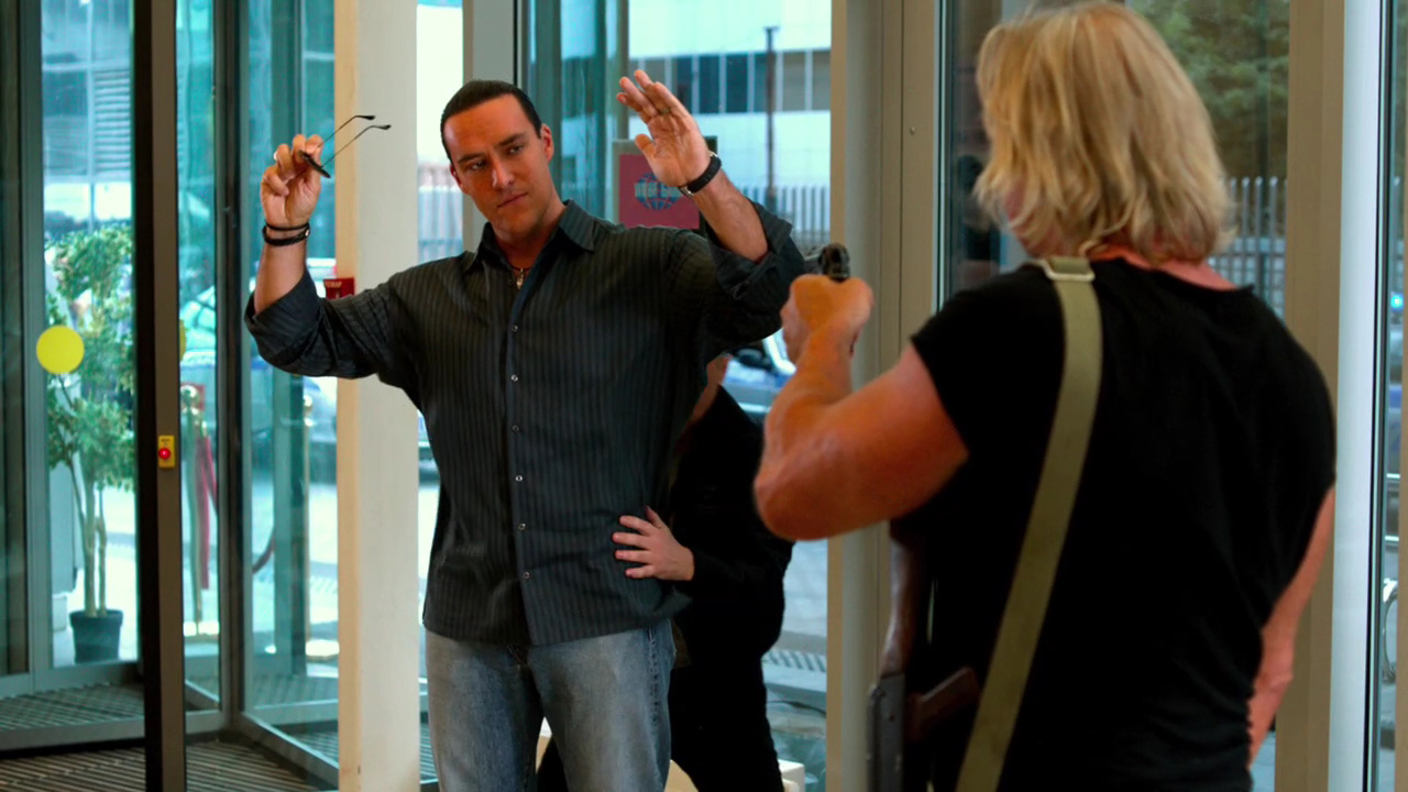 Бануэлос ведет Влада перекусить, но когда полицейский отправляется за едой - Влад видит двух негодяйских бандитов, которые вырывают у девушки сумочку. Влад немедленно вмешивается и сурово требует от бандитов прекратить баловаться. Но бандиты верят в силу оружия, поэтому угрожают Владу. Казатов одним ударом укладывает одного бандита и простреливает башку второму.