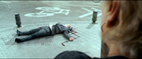 Один из работяг, пивший кофе у стойки, говорит, что несчастному надо помочь, и, хотя все просят его этого не делать, выходит из бара - его тоже тут же пристреливают.